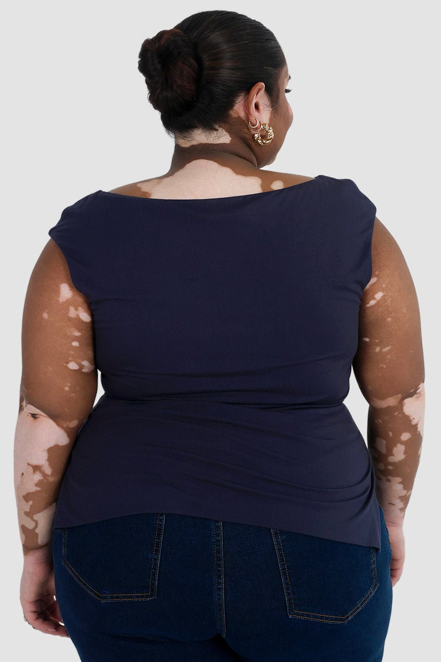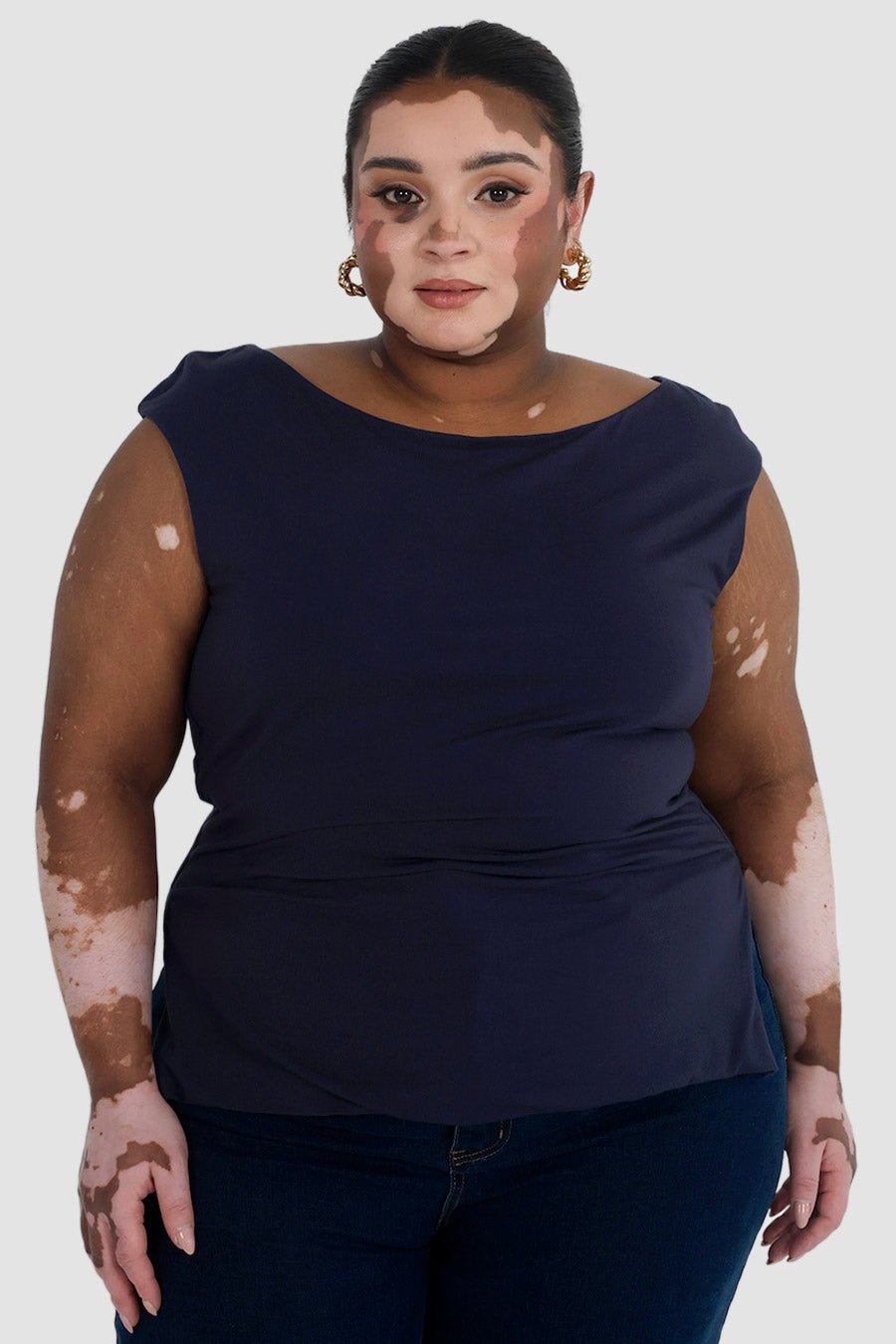 - Soft boat neckline with a sleek, sculpted shape