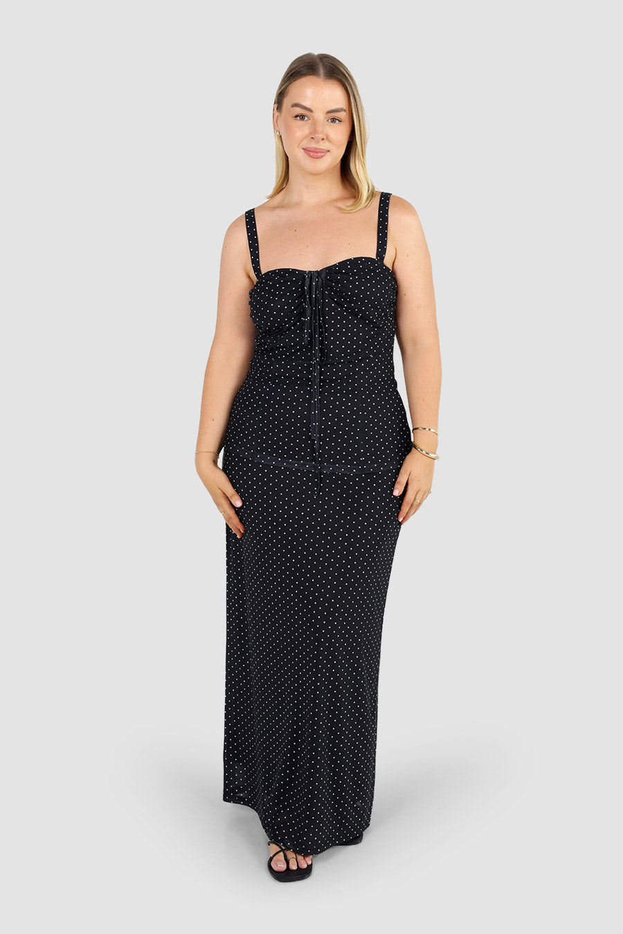 Meet Kiki, the kind of top that feels flirty yet considered. Designed with a structured bodice and soft ruching through the bust, she creates gentle shape and texture without feeling overdone. Crafted in a polka dot stretch mesh knit with thick adjustable straps, this top delivers a romantic feel that’s still easy to wear.