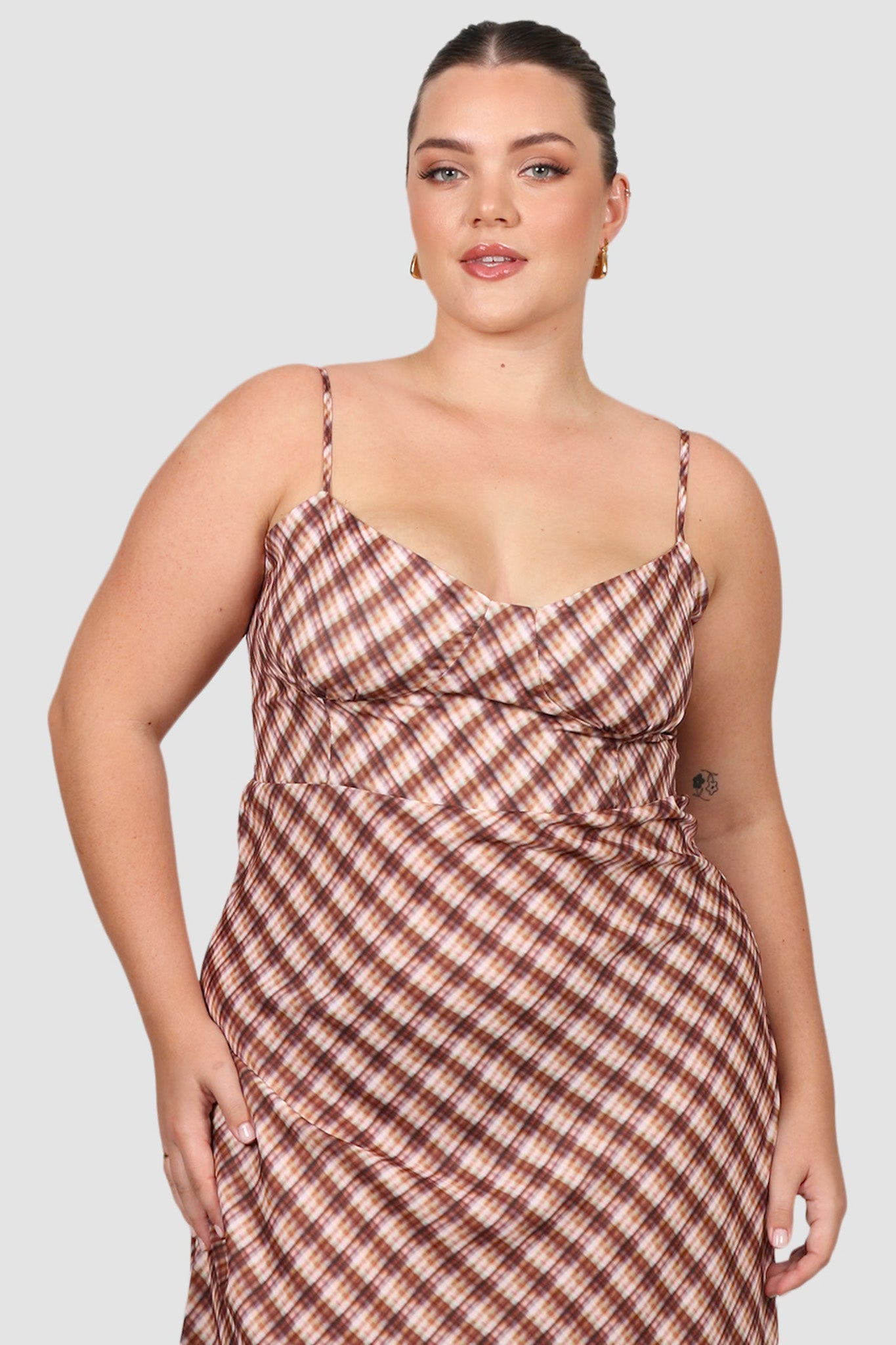 Note: our Margot Slip Dress Check and Natalia Dress Check are made from different materials. Margot in our silky slip material and Natalia in our stretchy mesh material.