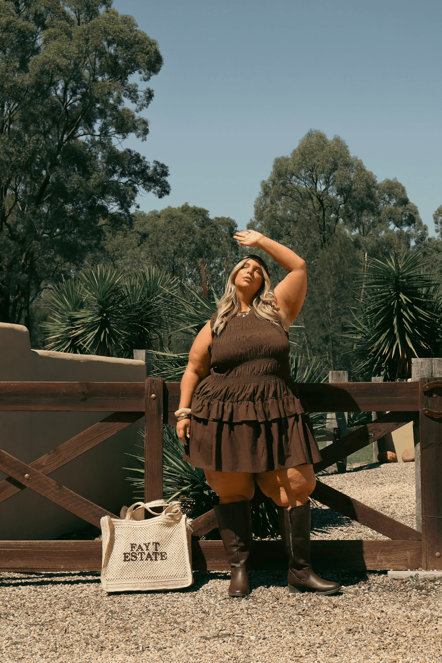 Meet Narah, the dress that does it all. Designed to sculpt, move and catch the light in all the right ways, she’s your go-to for festival days that turn into nights. Crafted from a breathable cotton linen blend with an ultra stretchy, fully shirred finish, she hugs in just enough while still feeling effortless and easy to wear. The wide neckline keeps things soft and balanced, while the tiered frill hem adds that extra movement that makes every step feel a little more elevated.