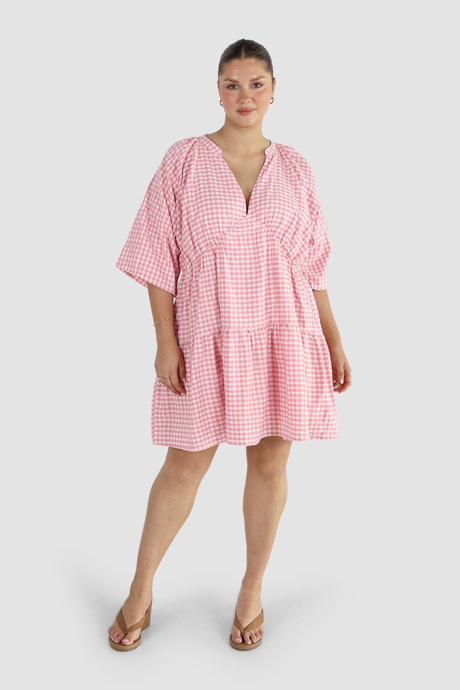 The dress that defines effortless style. The Salora Dress is designed in the cutest pink and white gingham and cut in a relaxed tiered silhouette that moves beautifully with you. Featuring a deep V-neckline, gathered waist seam and soft volume through the sleeves and hem, she’s the perfect mix of playful and polished.